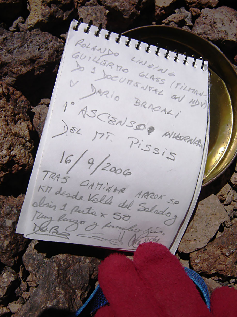 Jornada 3: El día de cumbre comienza en los acarreos de la pirámide y se alcanza el filo NNO para recorrer la última parte de la ruta Polaca (4) Por él se avanza hasta un gran nevero que llega hasta la base del Pissis IV, pero sin alcanzarla se asciende por la cara oeste de la cumbre GN hasta un filo algo desdibujado que une esta con el Pissis IV. Por él hasta el col entre la GN y la Principal y por la ladera de esta se salvan los últimos 120 metros hasta la cumbre. Desnivel: 845 m. Distancia recorrida: 2,6 Km.