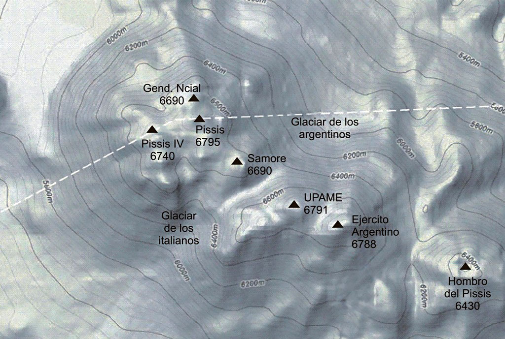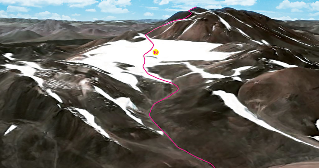 Jornada 3: Se avanza por el glaciar (35º - 40º) hasta que se sale del glaciar a 6.270 m y se continúa hasta el collado al oeste de dicho promontorio (que se observa por delante de la cumbre principal) Tomando el acarreo hacia arriba se bordea por el O la gran loma que se alza por encima, alcanzándose un paso desde donde se aprecia el filo somital al otro lado de un pequeño plateau nevado que asciende levemente hacia el O. Atravesándolo hacia el S, tras un resalte se accede al filo cerca de la cumbre Principal. Como alternativa se puede utilizar la variante del col que implica, en vez de cruzar el vallecito superior hacia el filo somital, transitarlo al O hasta el col entre las cumbres Gendarmería Nacional y Principal, y seguir el filo al S hasta ésta última. Desnivel: 895 m. Distancia recorrida: 2,9 Km. Tiempo de actividad: 6 a 8 hs.