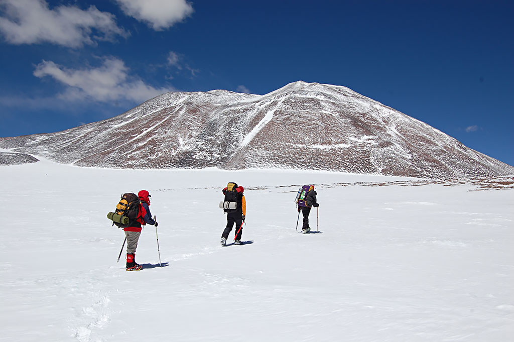 Jornada 1: Desde el CB Oeste se continúa por el valle demarcado por las estribaciones del Volcán Tres Picos hasta un gran campo de penitentes en donde se gira con rumbo E por una quebrada ascendente por donde discurre un pequeño arroyo. Se avanza por esta quebrada enmarcada por grandes campos de penitentes y el borde del Glaciar Oeste hasta la angostura que determina el fin del glaciar. Por una empinada hondonada se alcanza ya por el hielo la margen oeste del glaciar donde se instala el campo 1 (27°44’03,1’’S / 68°51’40,8’’O, 5.600 m) Desnivel: 600 m. Distancia recorrida: 5,3 Km. Tiempo de actividad: 5 a 6 hs.