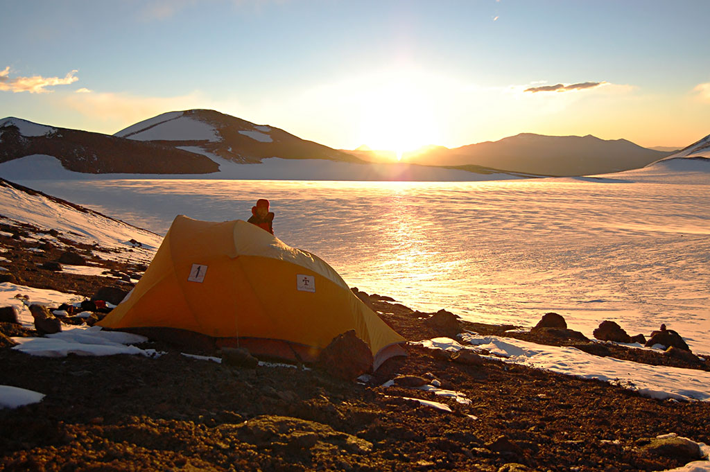 Jornada 2: Al otro día se realiza la travesía del glaciar de casi 7 km pero con 350 metros de desnivel. Se acampa en la base de la pirámide cumbrera (27º 44 21,2 S – O 68º 48 45,5 O, 5.950 m) Desnivel: 350 m. Distancia recorrida: 6,5 Km. Tiempo de actividad: 5 a 6 hs.