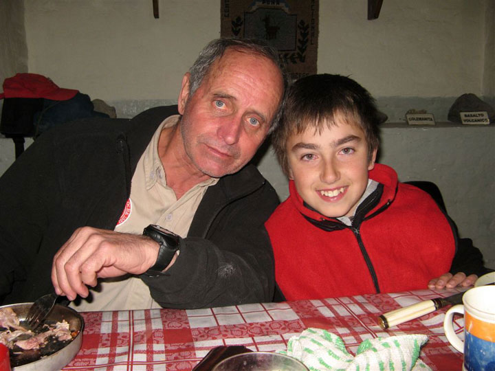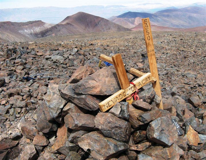 Nos paramos como podemos y nos sacamos algunas fotos de cumbre. Observamos los derruidos signos del santuario de la cumbre y luego vuelvo a protegerme para intentar hablar por teléfono ya que me dijeron que acá había señal. Prendo el aparato y es verdad. Llamo a Fernando Martinis, presidente del club, para contarte del ascenso y ver si sabe algo del grupo del Pompeya. Estoy contento con nuestra escalada, pero mi corazón quiere con pasión que mi hijo Juan que está en el Pompeya intentando su primer 4000, haya hecho cumbre y esté bien. Fernando nos felicita y pronto me dice que los del Pompeya ya volvieron e hicieron todos cumbre. Juan también y con no poco esfuerzo. Ahora si estoy completo y la alegría verdadera me invade y me abrazo con Eduardo y le cuento del ascenso de Juan.