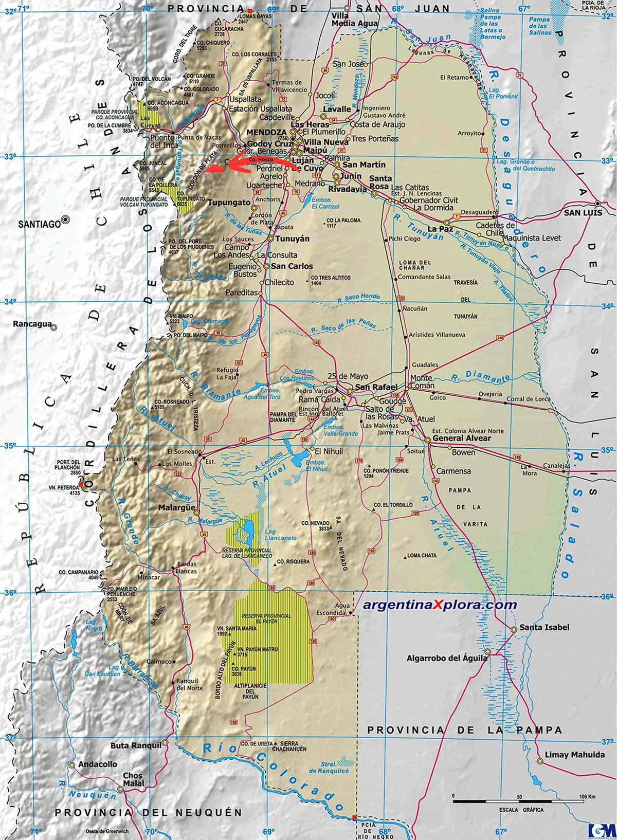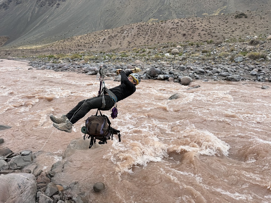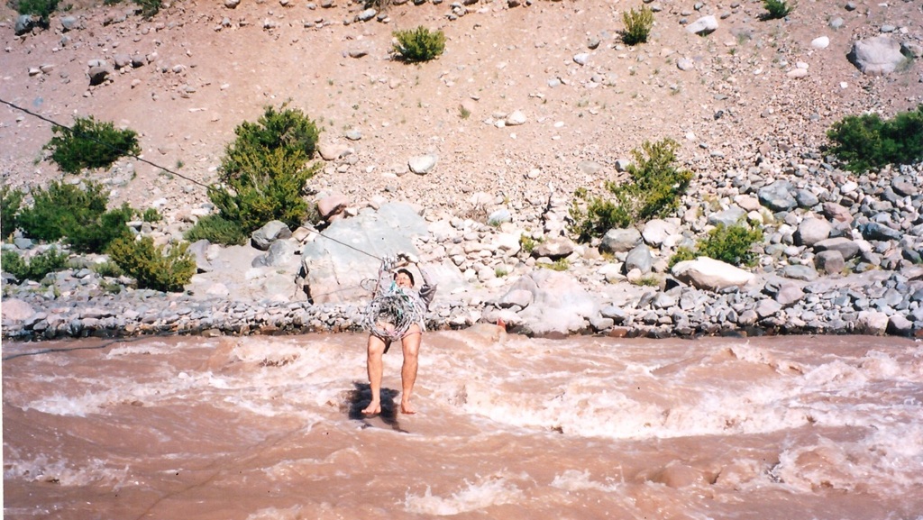 Una vez que el andinista deja atrás Punta de Vacas, lo primero que hay que resolver es el cruce del Río Tupungato. Antiguamente había un frágil cable de acero cerca del agua con un añadido que obligaba a meterse en el agua si el curso estaba muy crecido. Por eso optábamos por el gran cable del carrito, maniobra complicada a demasiada altura, larga distancia y donde se tomaba velocidad, amén de que del lado este la precaria escalerita de madera daba su jaleo. Hoy han reemplazado el viejo cable emparchado por uno nuevo y con cualquier polea de alpinismo se puede cruzar. La posibilidad de vadear tiene lo suyo y salvo en pleno invierno o al cabo de varios días muy fríos, no es recomendable.