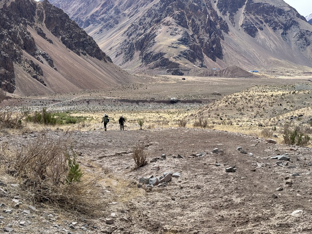 Casi de tardecita, sobre los 3.650 m, llegamos a hasta una bonita zona plana, próxima a dos atractivas agujas rocosas de la margen norte, vuelve a correr un arroyo donde volvemos a vivaquear detrás de un muro que tiene más de protección ceremonial de qué utilidad práctica. Hoy ganamos 1.200 metros de desnivel.