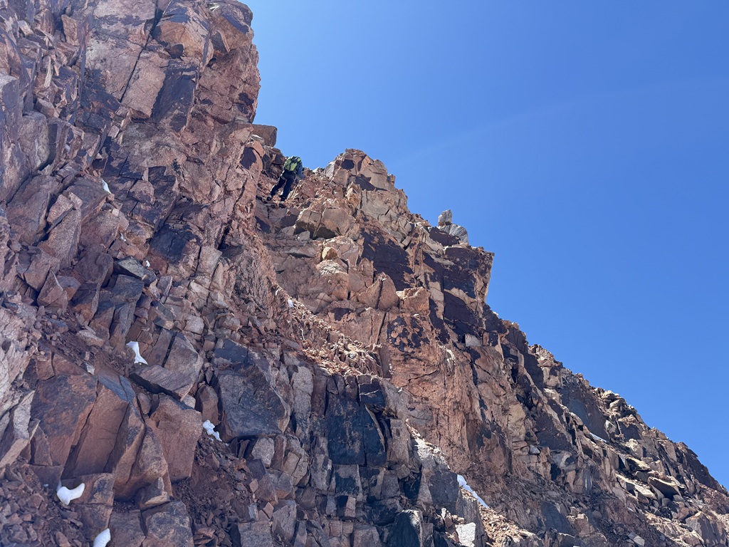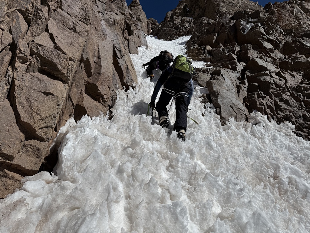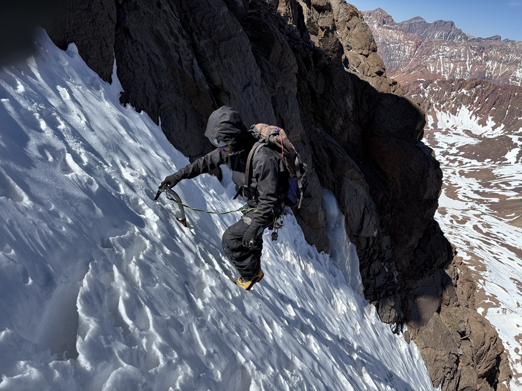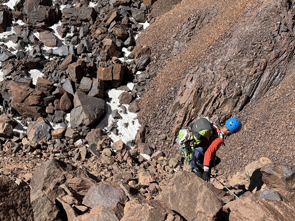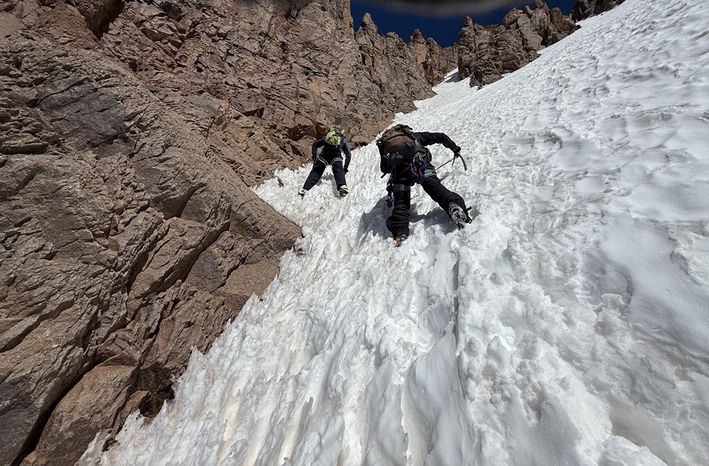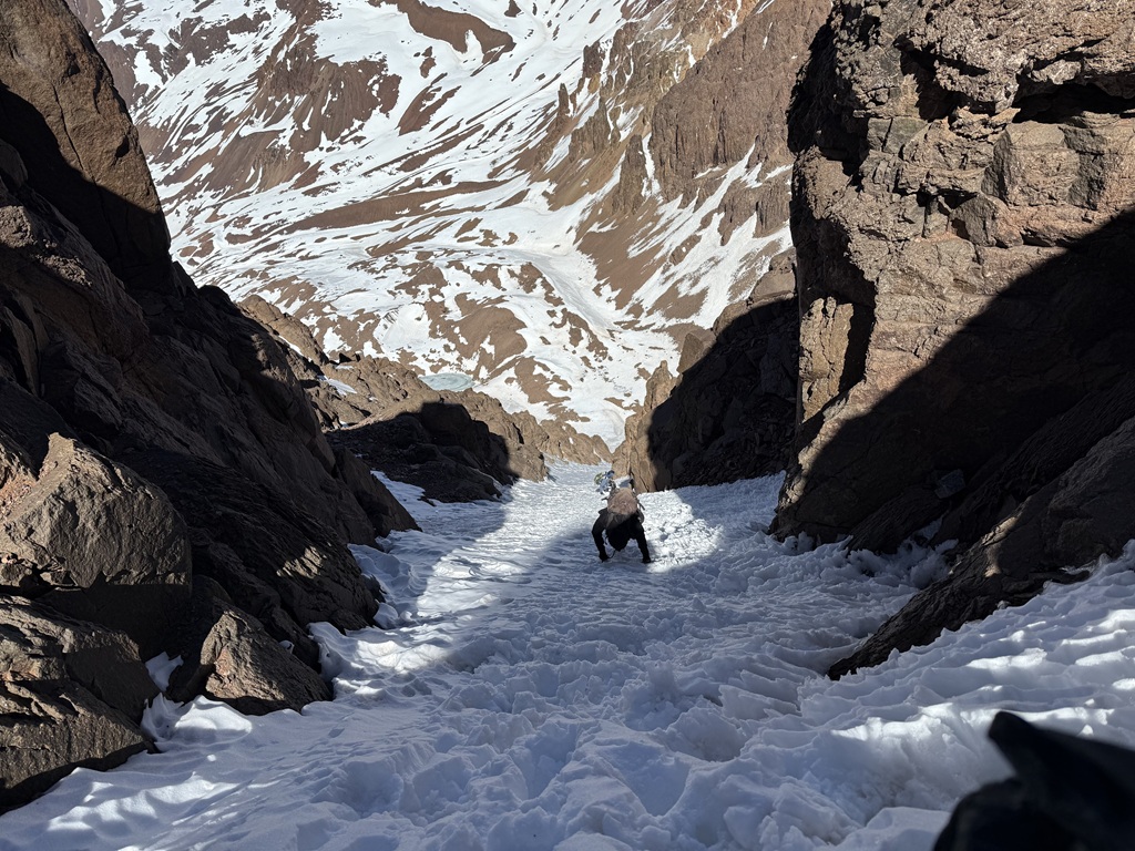 Hay una decisión a tomar: seguimos por los riscos o –de algún modo– usamos una empinada pala nevada a la izquierda. Lisandrito ya escaló hasta la base de los riscos, pero hay oportunidad de desescalar por roca para tratar de empalmar la pala de nieve.