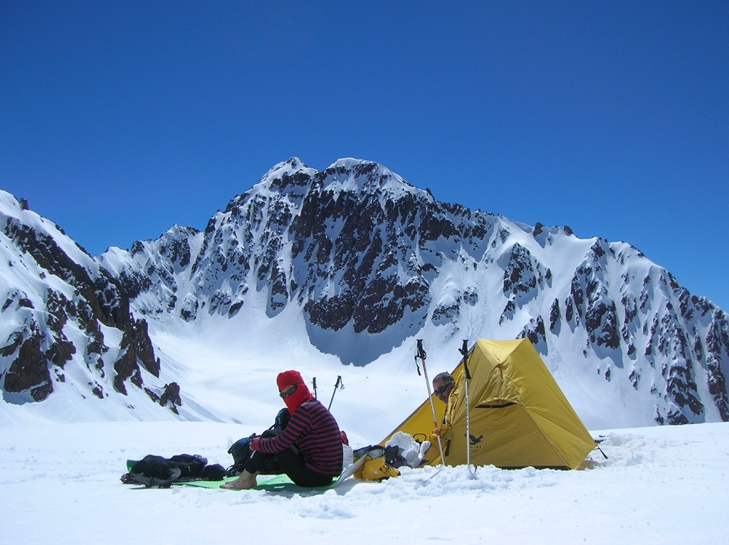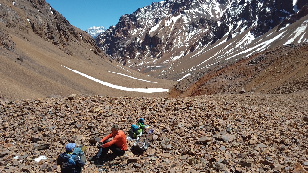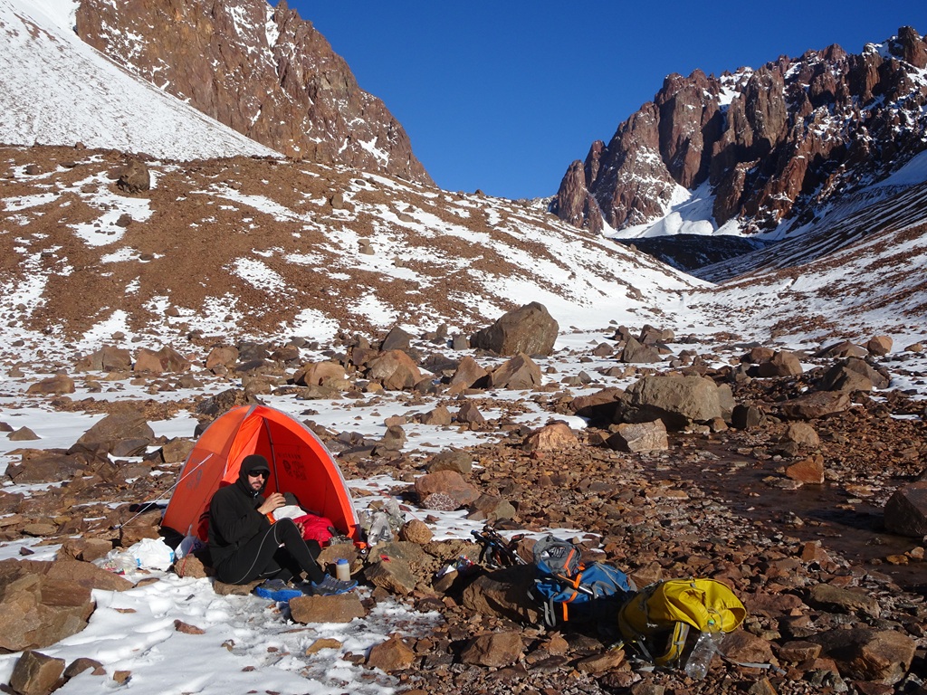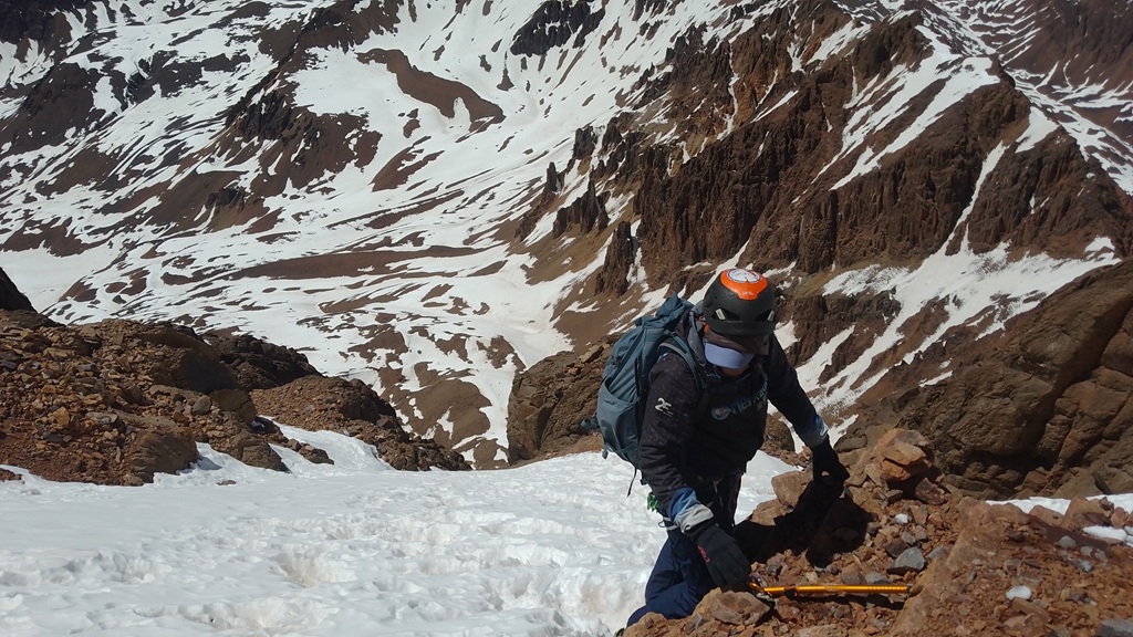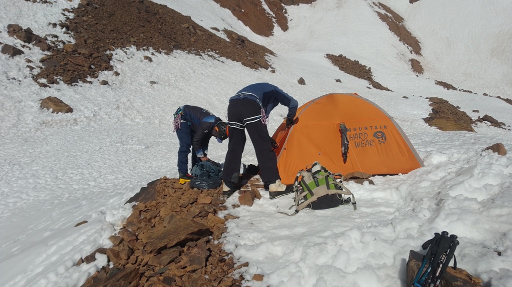 Exactamente en este momento, ya buscando sitio para montar por primera vez la carpa, terminamos semanas de incertidumbre. La única vía posible en los riscos que presenta la cara este del cerro es una estrecha canaleta que tiene que estar nevada para poder escalarse. Revisábamos diariamente los partes meteorológicos y nos comunicábamos las novedades. ¿Nevó? ¿Cuánto? ¿Cómo sigue la temperatura?