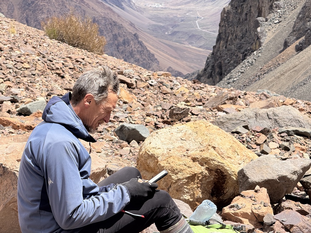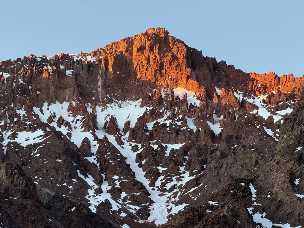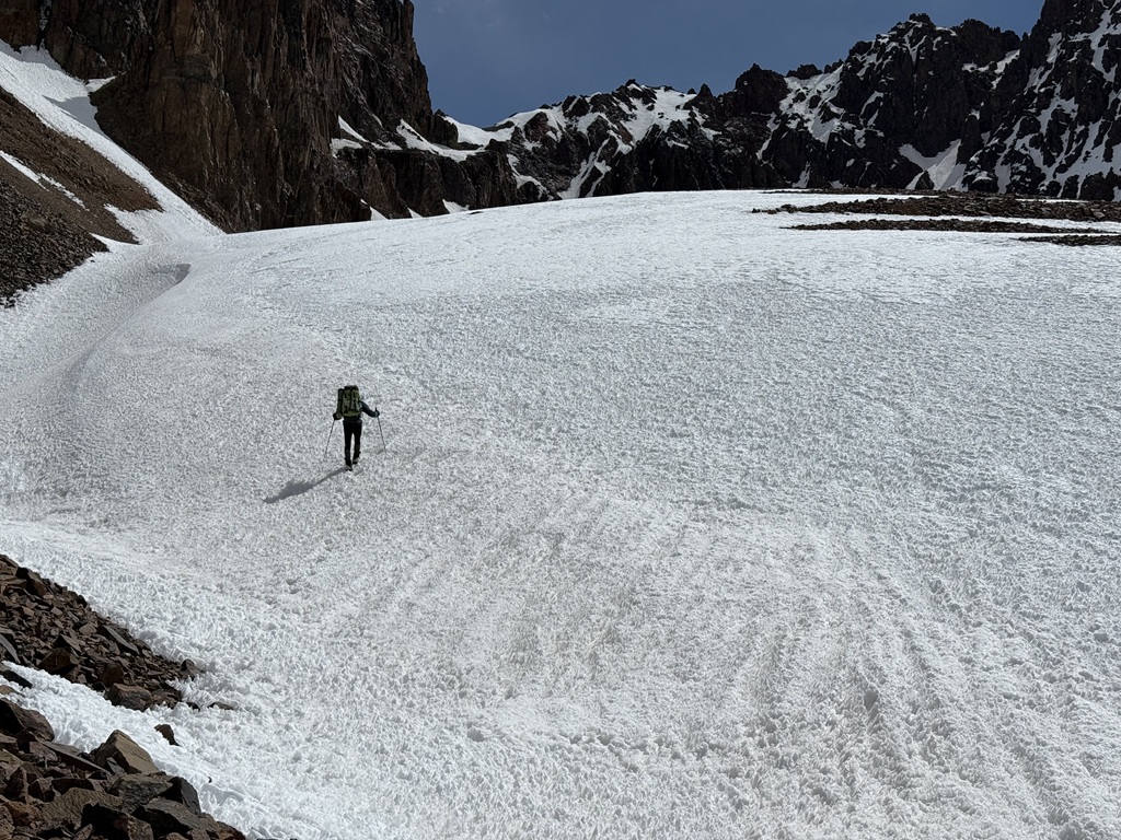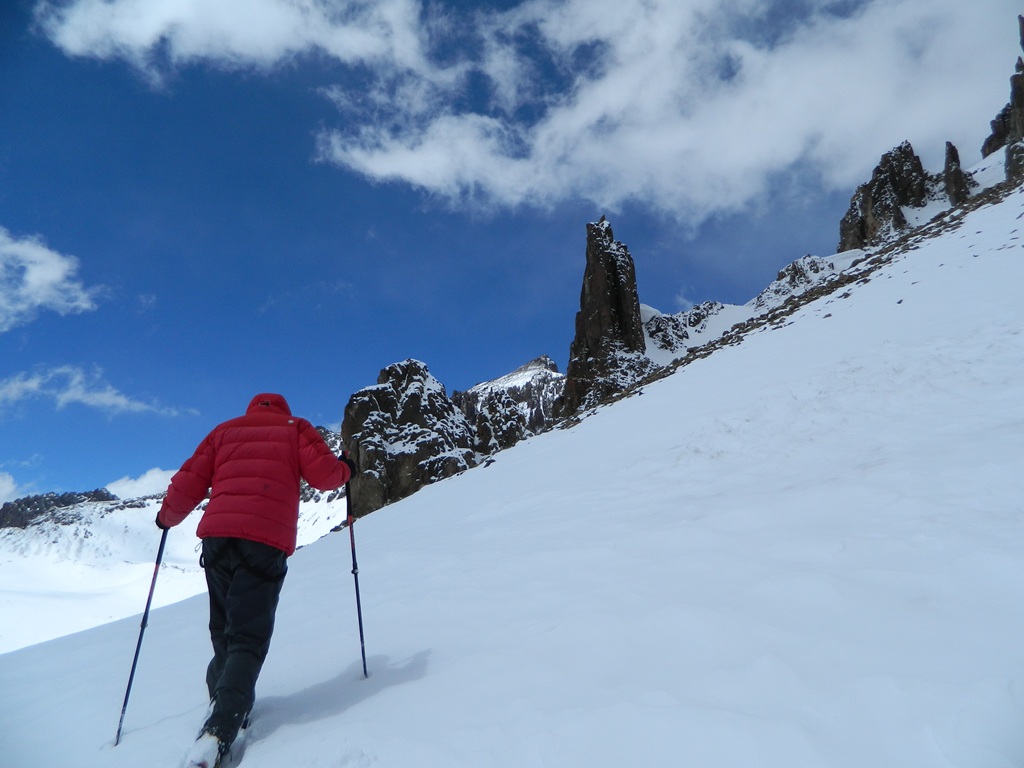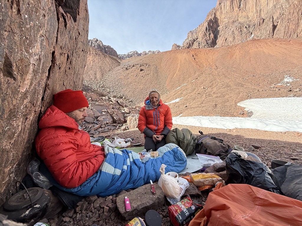 Exactamente en este momento, ya buscando sitio para montar por primera vez la carpa, terminamos semanas de incertidumbre. La única vía posible en los riscos que presenta la cara este del cerro es una estrecha canaleta que tiene que estar nevada para poder escalarse. Revisábamos diariamente los partes meteorológicos y nos comunicábamos las novedades. ¿Nevó? ¿Cuánto? ¿Cómo sigue la temperatura?
