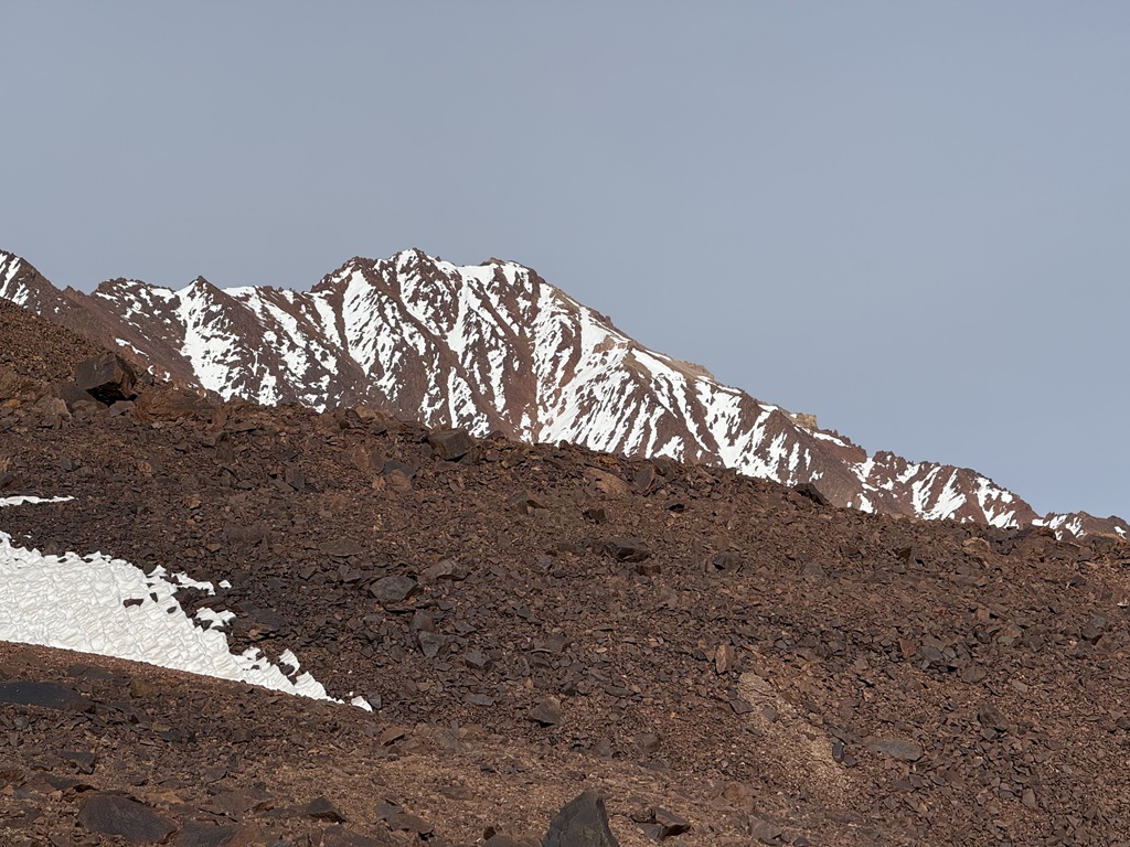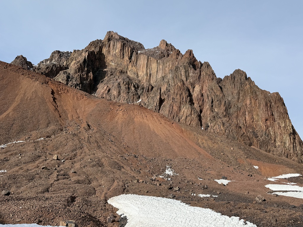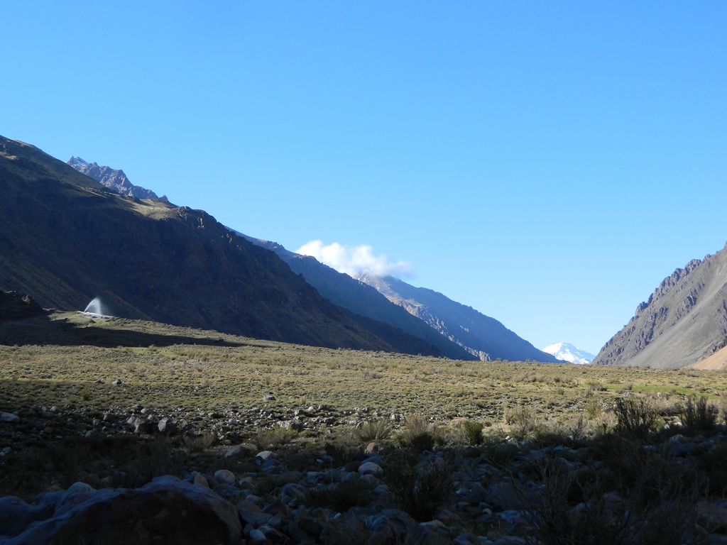 Después de pequeñas penurias, bajadas aunque uno este subiendo, subidas aunque se este regresando, frentes de glaciares de escombros, deslizamientos espontáneos de láminas de roca suelta, vueltas y mas vueltas, este ”mal tramo” concluye de modo casi abrupto superando los cuatro mil metros, Un pequeño llano conduce a un frente rocoso recién liberado por el glaciar, sitio ideal para acampar, porque también tiene agua. Al oeste, en la margen sur del Valle, asoman dos montañas atractivas, el cerro Cola Blanca, que subimos en 2018 con Ramiro Casas y la muralla de rocas rojizas que ni nombre tiene, y dudamos que vaya a tenerlo porque aunque es ideal para la escalada en roca la distancia la pone “fuera de los deseos” de quienes se especializan en eso.