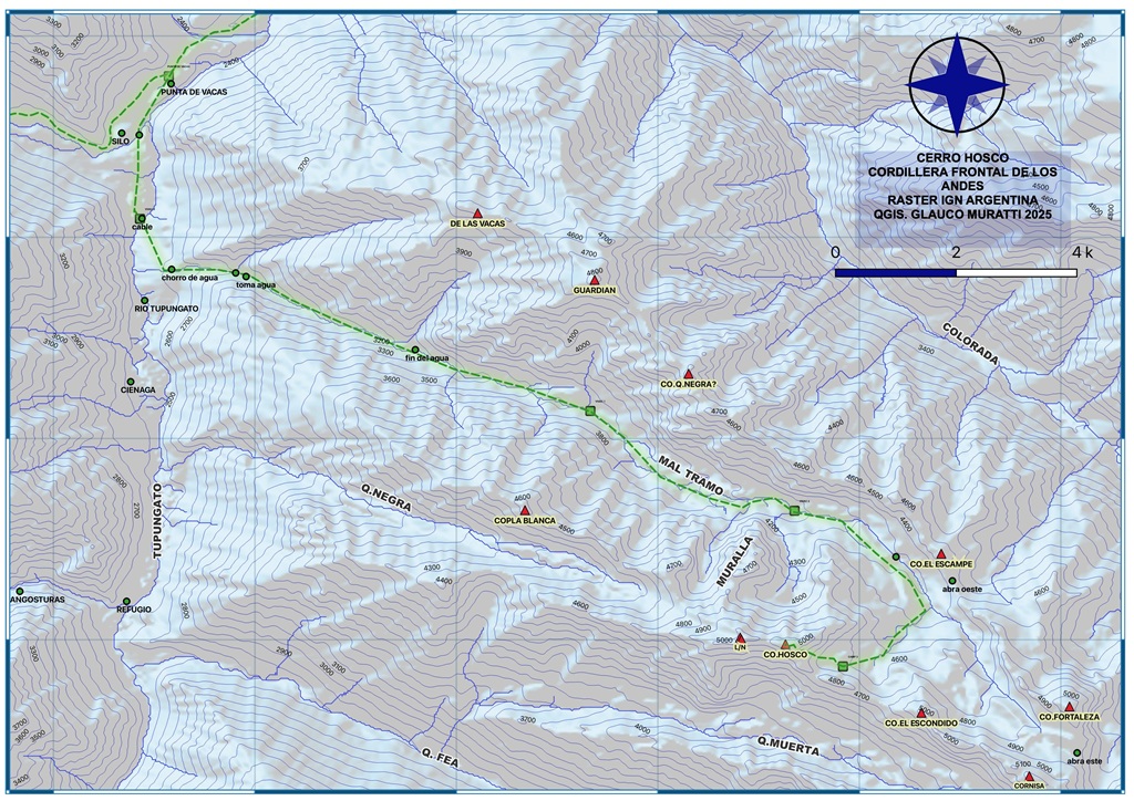 Desde Punta de Vacas mirando al sur se observa la quebrada del Río Tupungato. A la izquierda el chorro de agua, al fondo el Volcán Tupungato, el valle que se ve con una nube encima es la Quebrada Fea, antepuesta, apenas se nota lo que el IGN denomina ”Quebrada Negra” que usamos para subir el Cerro La Nadita. Fuera de cuadro, a la izquierda del chorro de agua se ingresa a la quebrada que lleva al Cerro Hosco.
