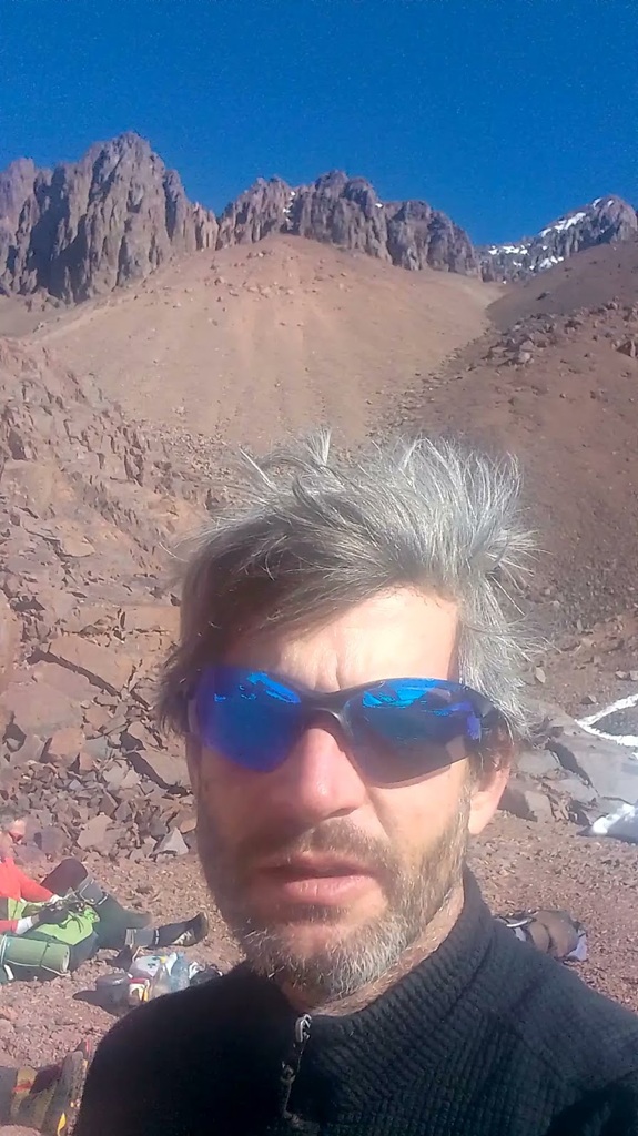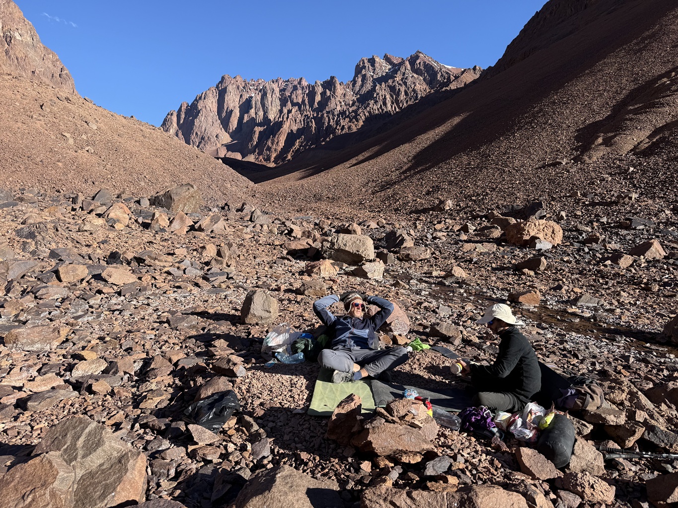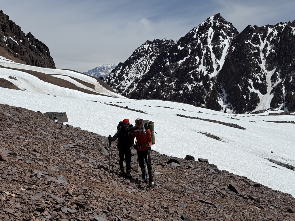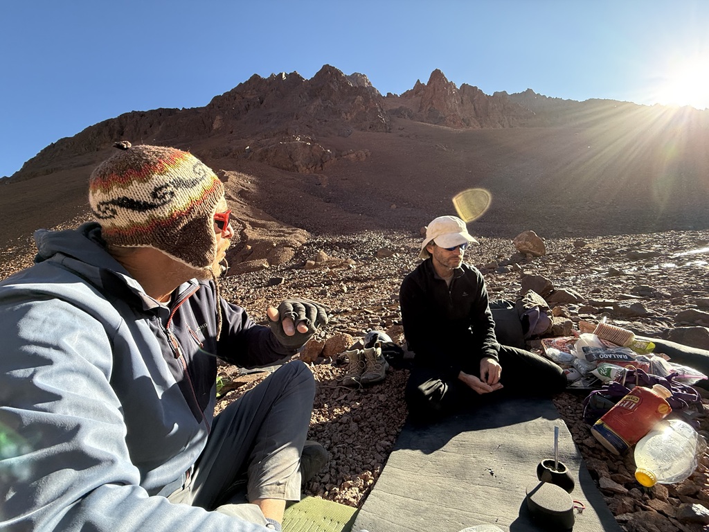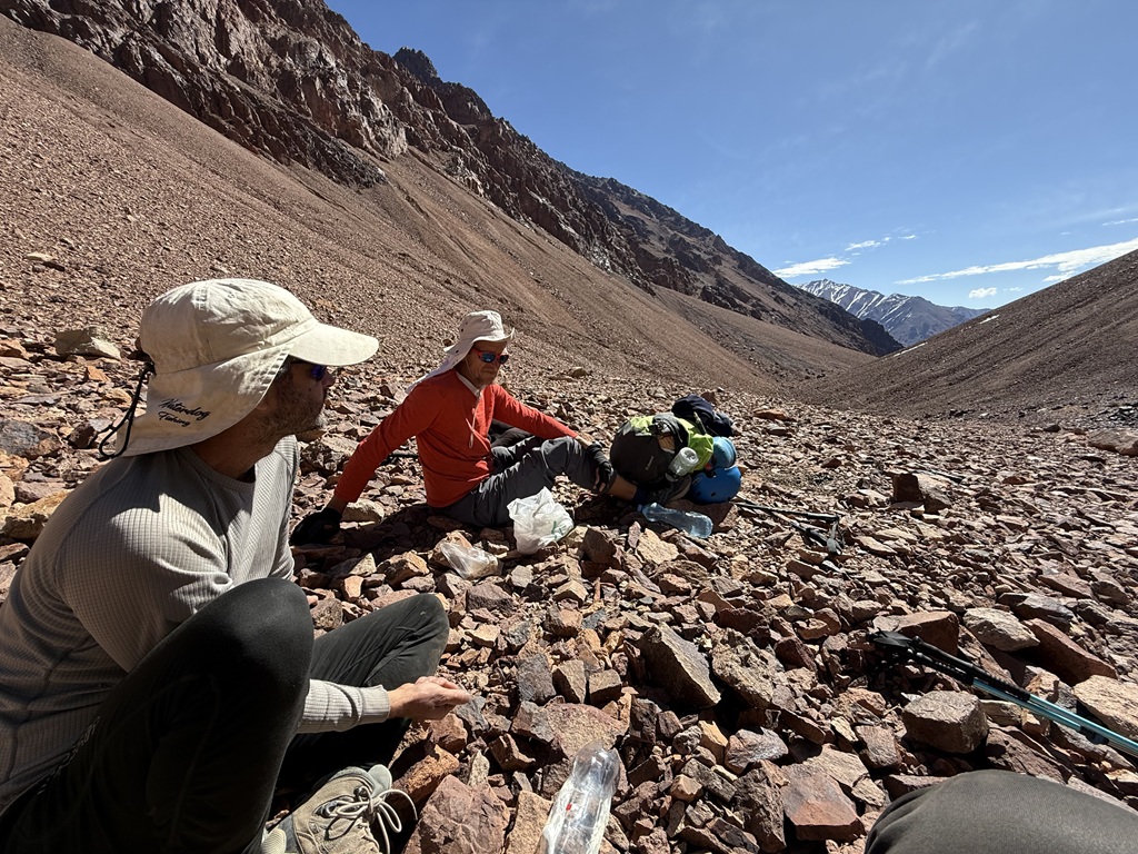 Vivac sobre los cuatro mil metros, en primer plano Lisandro Arelovich, atrás Gervasio Fierro. Atrás está la implacable forma del frente de un glaciar de escombros que proviene de un valle conectado con la montaña que vamos a subir. Pero falta mucho, no es por ahí, deberemos dar todavía un gran giro para encontrar la cara este.
