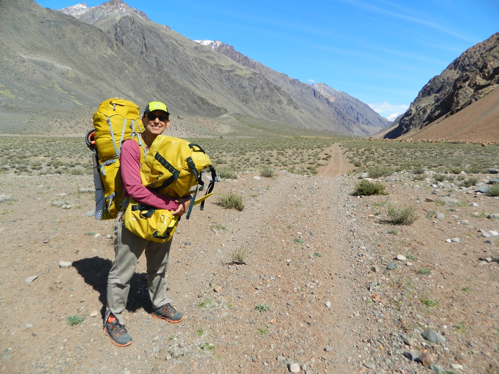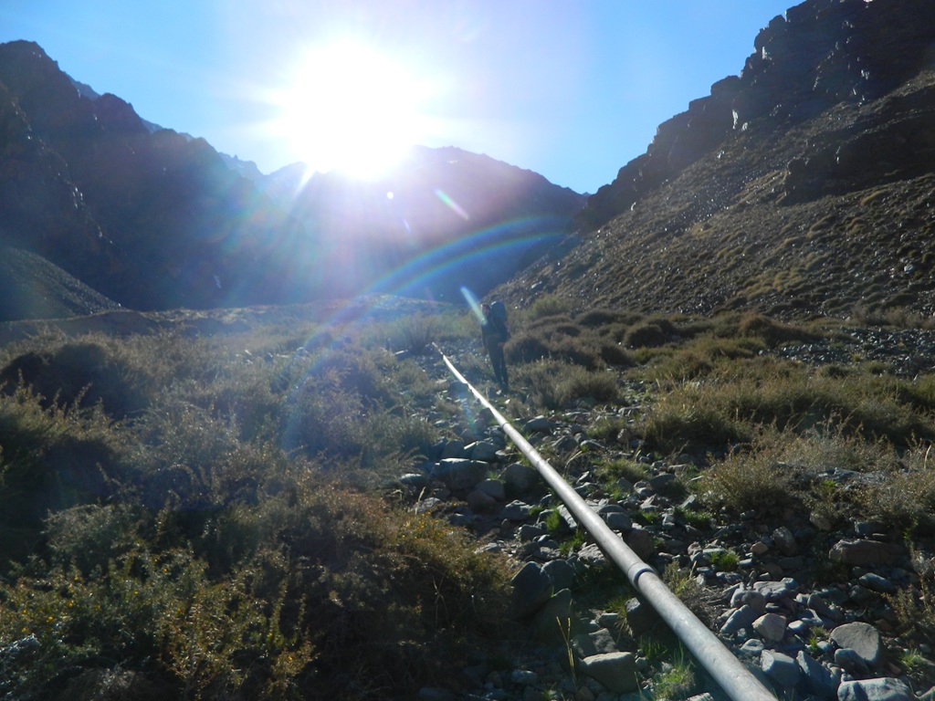 De mañana trasponemos el río y seguimos el trayecto del caño de agua pasando al costado del escape de agua para ingresar a un temperamental, cerrado y empinado valle cubierto en esa zona con arbustos espinosos. Aquí no hay tracks y de senderos hay que olvidarse, se trata de navegar entre rocas, muchas de ellas redondeadas, lo que en la bajada exigirá concentración. Son algunas horas de paisaje algo encerrado y áspero.