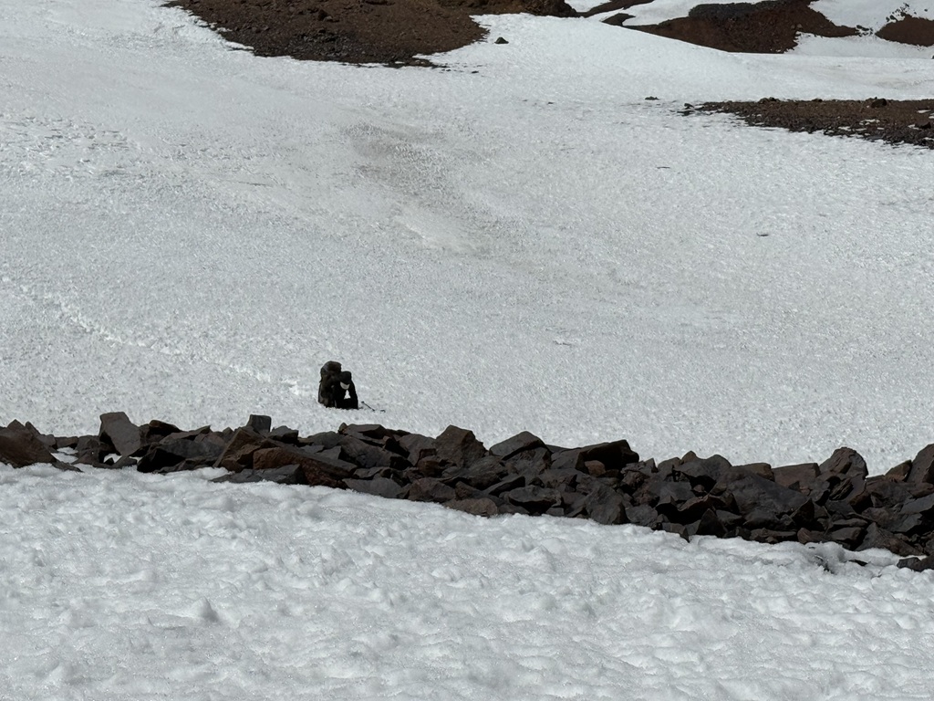 Como cada vez que pasamos por acá, este sector lo atravesamos nevado. Esta vez el sol ablanda la nieve, haciendo un cambio de prioridades, en vez de rumbos lógicos, serpenteamos para evitar hundirnos. En un momento giro y veo a lo lejos a Lisandrito enterrado hasta la cintura, fue demasiado ambicioso, hoy, a mediodía, la línea recta es pecado capital. Lo esperamos y aprovechamos para almorzar, homenajeamos la meteorología con un colorido salamín picado grueso, para nosotros ninguna sospechosa y maravillosa moda alimentaria con menos de varias décadas de probada.