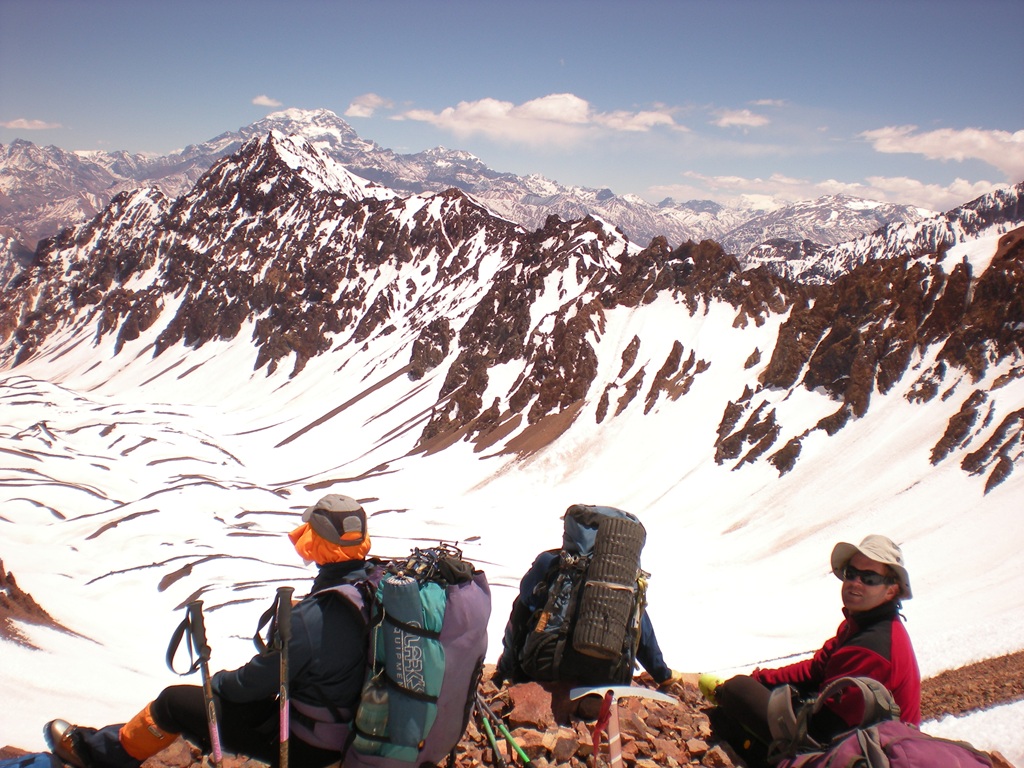 Mis compañeros con la vista del Cerro Quebrada Negra, un alto cuatro mil probablemente sin ascensos. El notorio canal de nieve que parece conducir a la zona somital no es tal, es una vista engañosa, no tiene conexión. A la izquierda, más pequeña, el Aconcagua.
