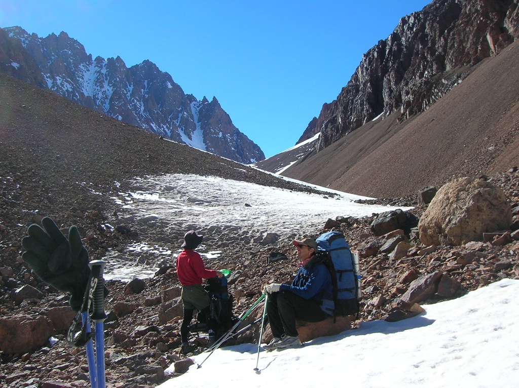 Como no hay nieve, luego de algunas deliberaciones -en las que oculto mis deseos de quedarme en este lugar- cargamos un poco de agua porque en adelante la quebrada queda seca por varias horas. Es temprano todavía, mis compañeros tienen razón.