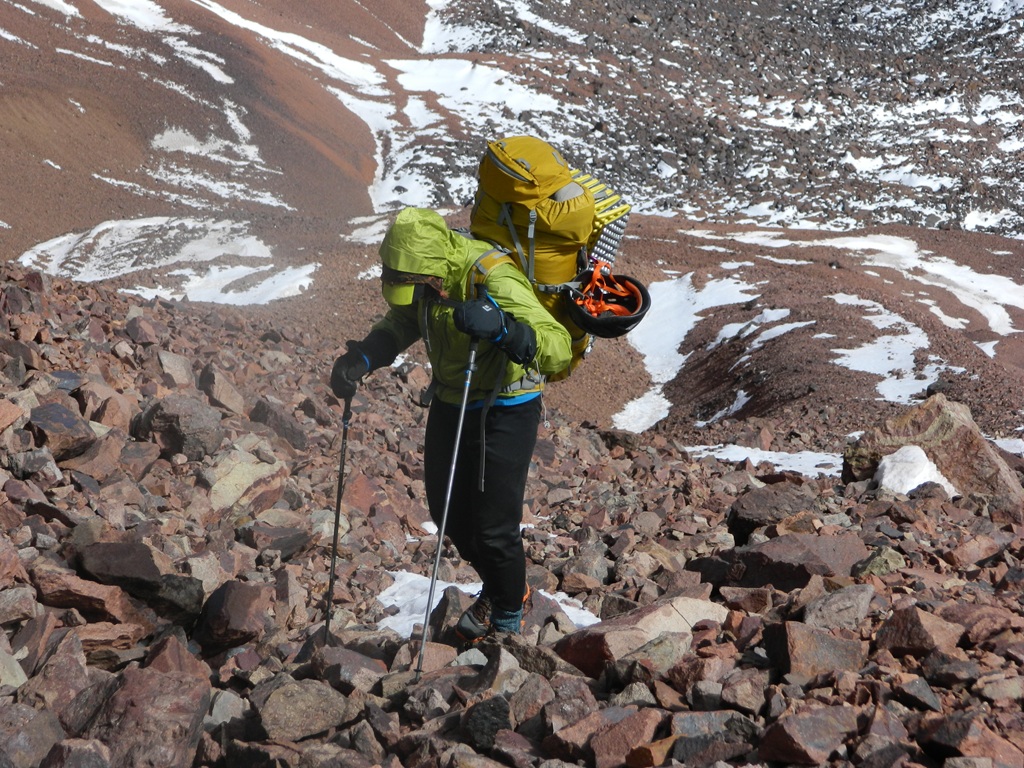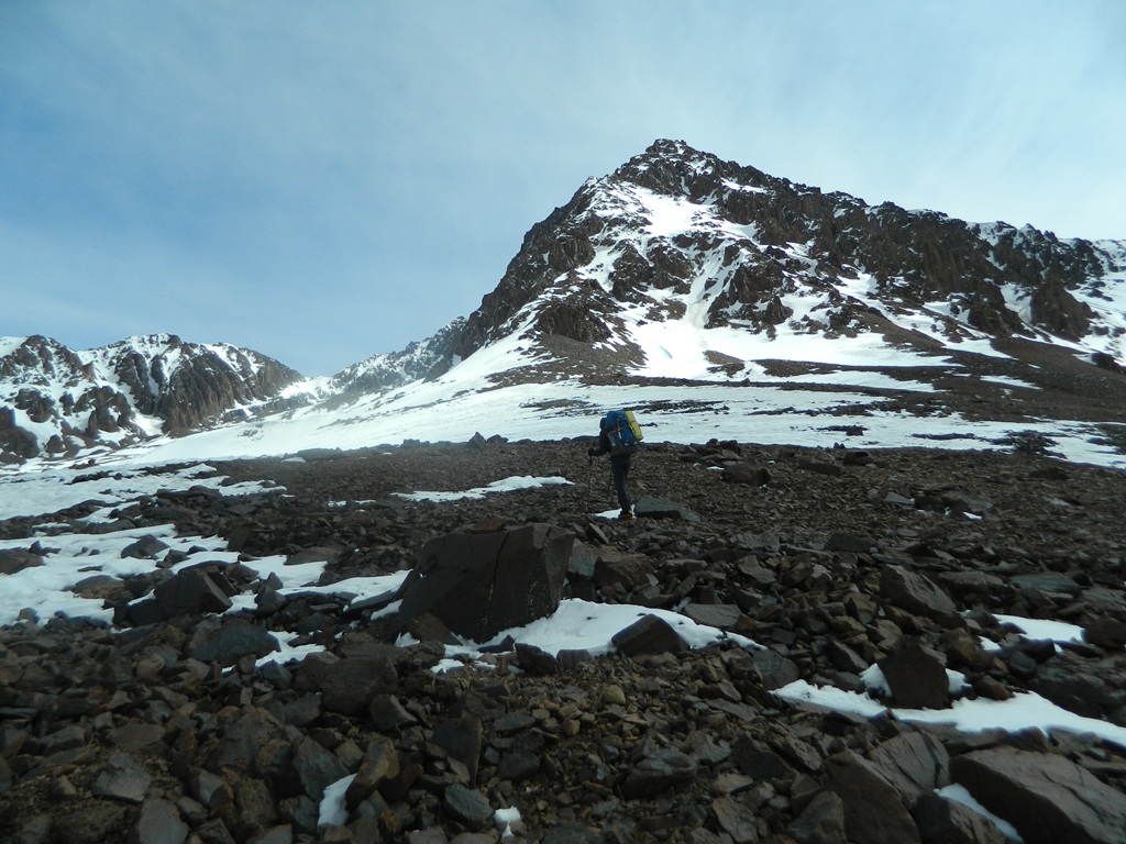 Da comienzo lo que va a ser el momento más riesgoso de toda la excursión. Lentamente, con cuidado y paciencia, atravesamos los primeros cientos de metros del mal tramo en diagonal de derecha a izquierda hasta quedar al pie del frente de un gran glaciar de escombro que proviene de una lúgubre cavidad lateral. Sabemos que subiendo evitamos el descalabro que puebla el centro del Valle. El problema es que bajo la apariencia de una ladera empinada y cubierta de roca fina, se esconde terreno helado donde la bota no consigue pisar.