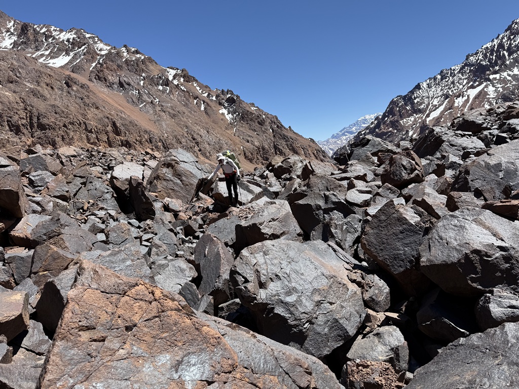 El tercer día el avance se facilita, un océano de rocas pero sin glaciares de escombro obturando el valle. (Foto Ramiro Casas)