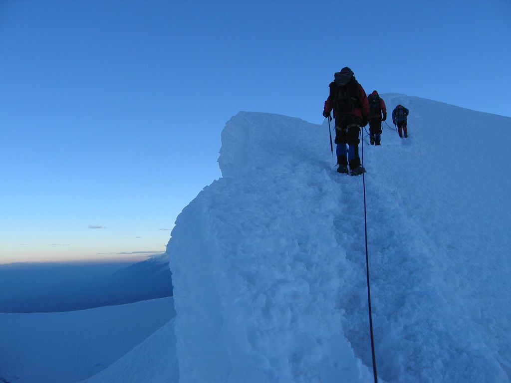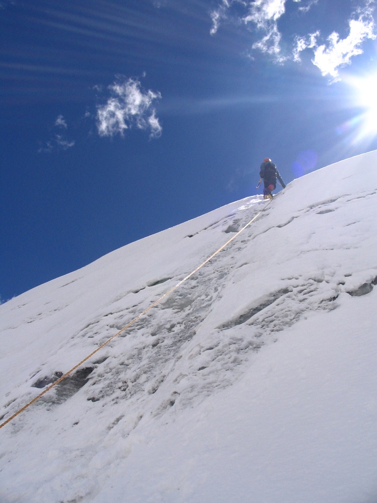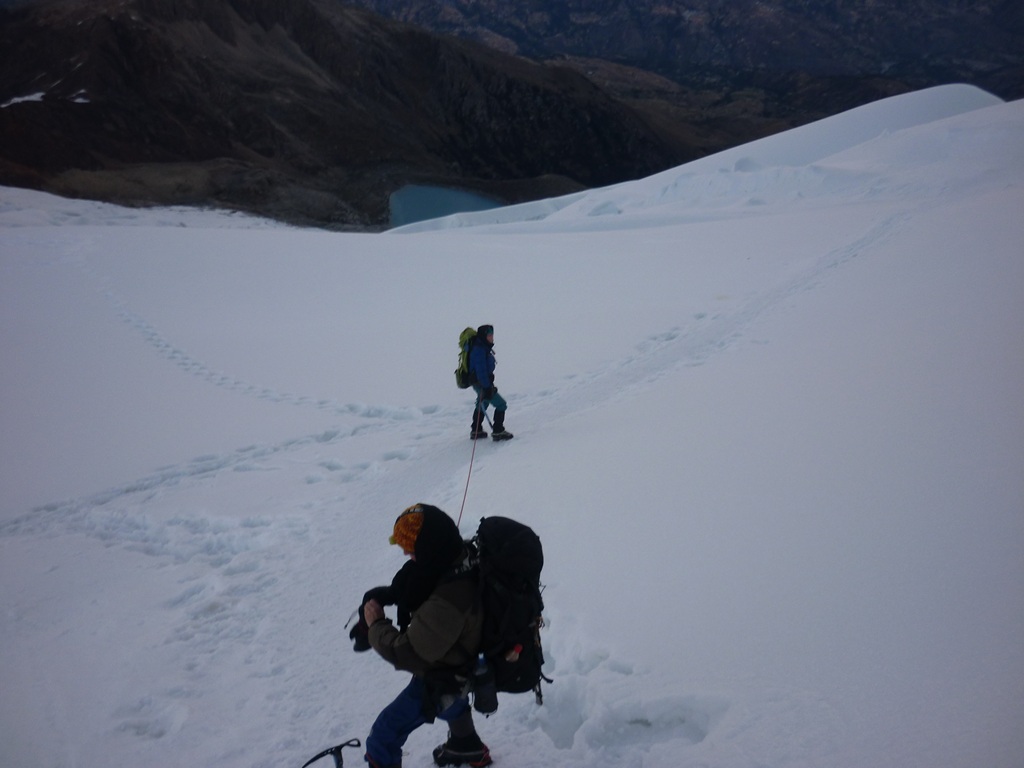 Nos levantamos a las 12 de la noche, hidratamos y caminamos hasta la lagunita glaciaria donde nos pusimos los crampones y nos encordábamos, el guía local abría la cordada, los alpinistas europeos le seguían mientras que yo la cerraba.