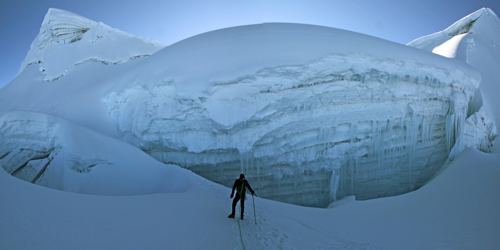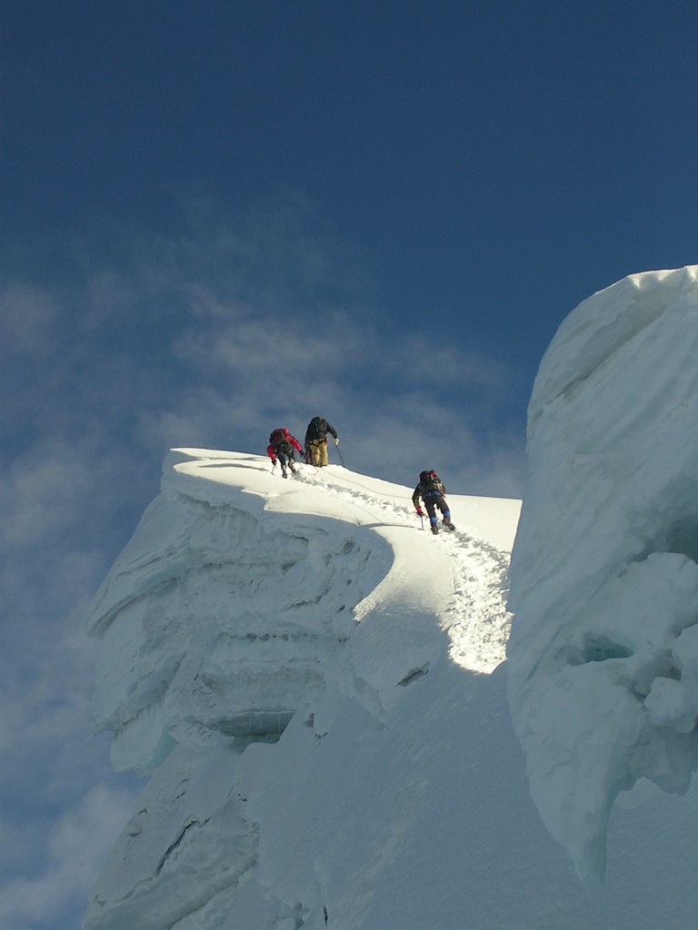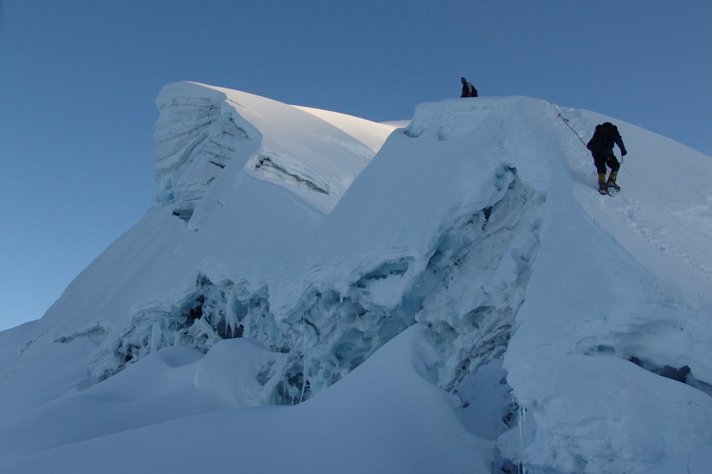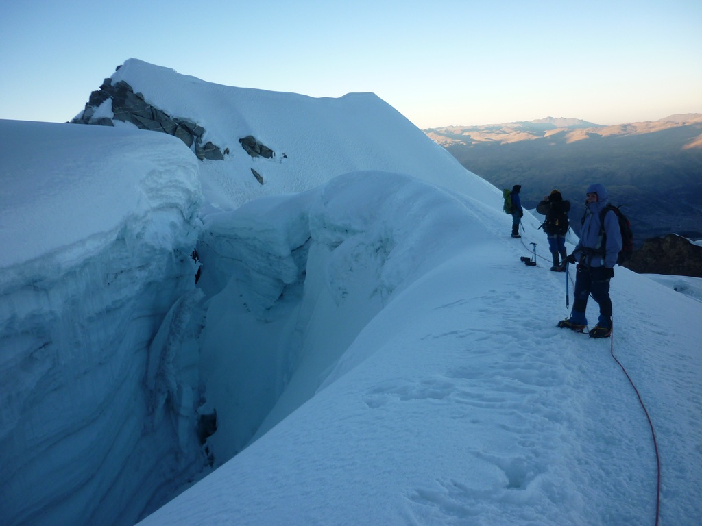 Las grietas que pasábamos solo se manifestaban por surcar el blanco inmaculado del hielo y la nieve con un negro que se perdía en las profundidades que veríamos recién en la bajada con la claridad del día.
