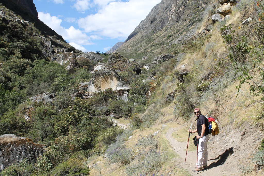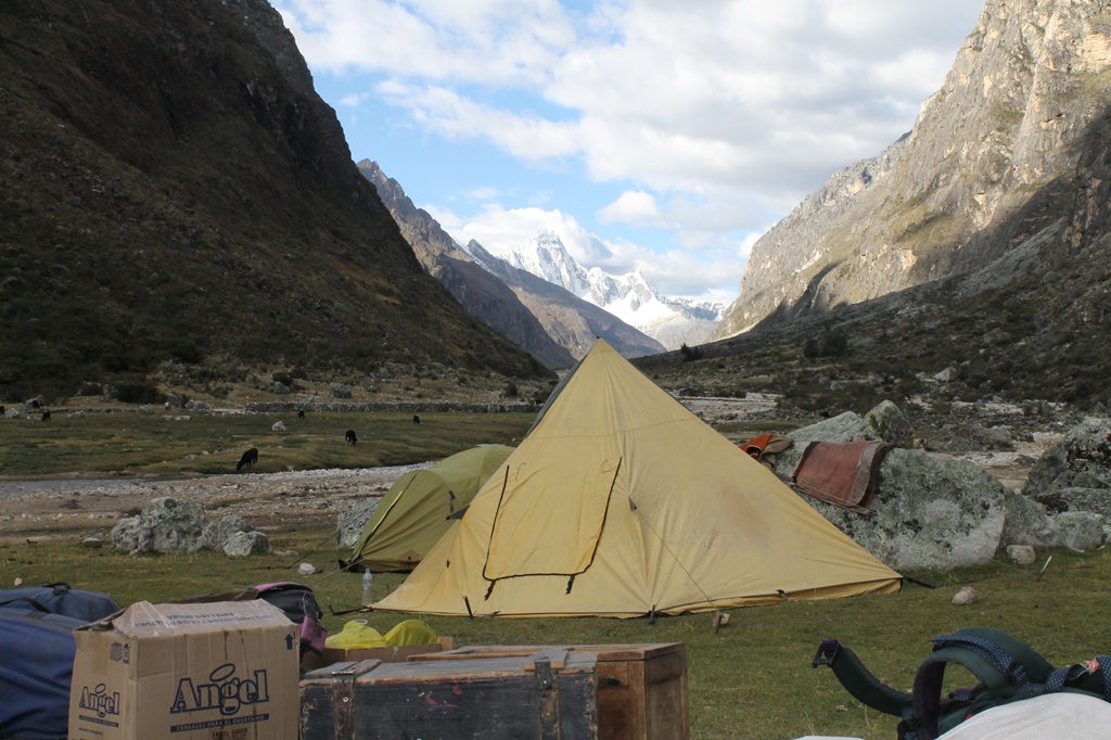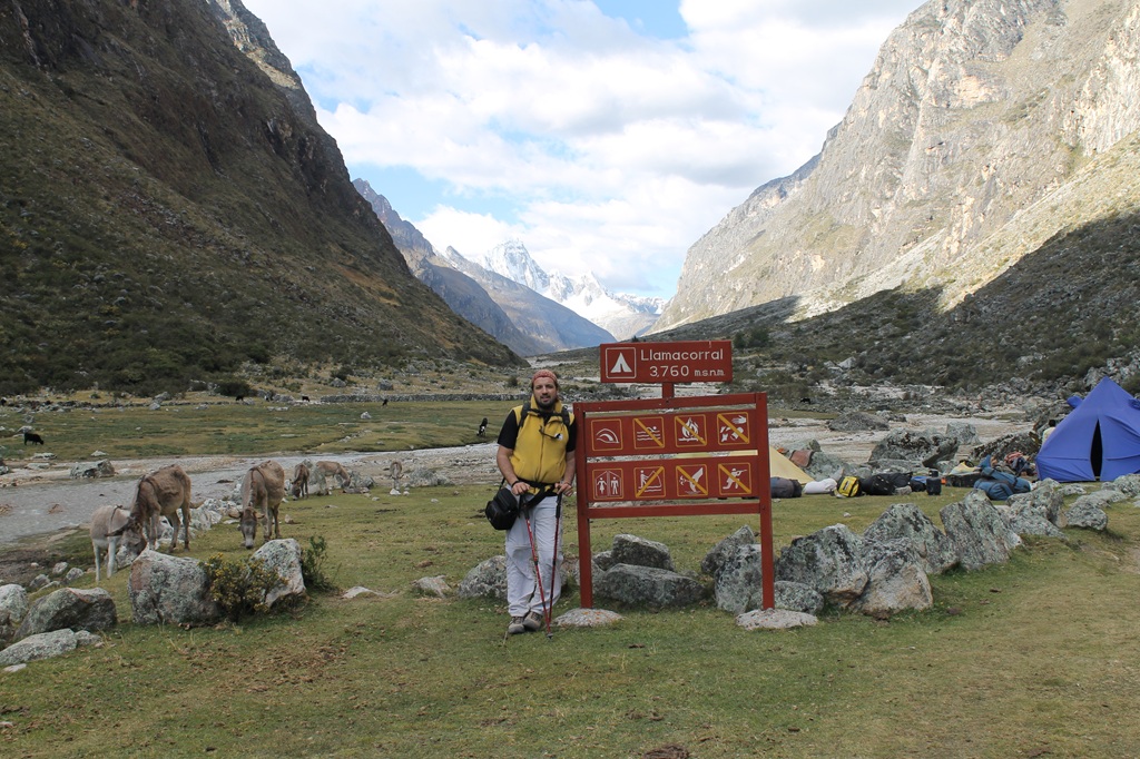Nosotros empezamos el trekking ascendiendo una cuesta por la estrecha Quebrada Santa Cruz hasta llegar a nuestro primer campamento Llamacorral que está a 3760msnm lo que nos daba un desnivel de casi 900 m en el primer día y que nos llevó recorrerlo unas 5 h. Aproximadamente.