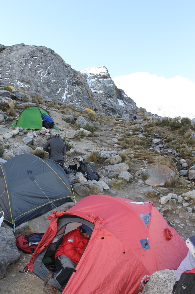 Aquí nos encontramos con otra expedición de mujeres y se nos complicó mucho encontrar lugar para las carpas ya que el suelo tenia mucho desnivel y piedras, pero luego de utilizar nuestros piolets logramos dejar todo liso como para instalar nuestras carpas y dormir muy cómodamente hasta las 12 de la noche hora en la que nos levantaríamos, ya que por el calentamiento global se ha notado una gran inestabilidad en los nevados de la cordillera blanca por lo que salir de madrugada con las bajas temperaturas de la noche ayuda mucho a minimizar accidentes..